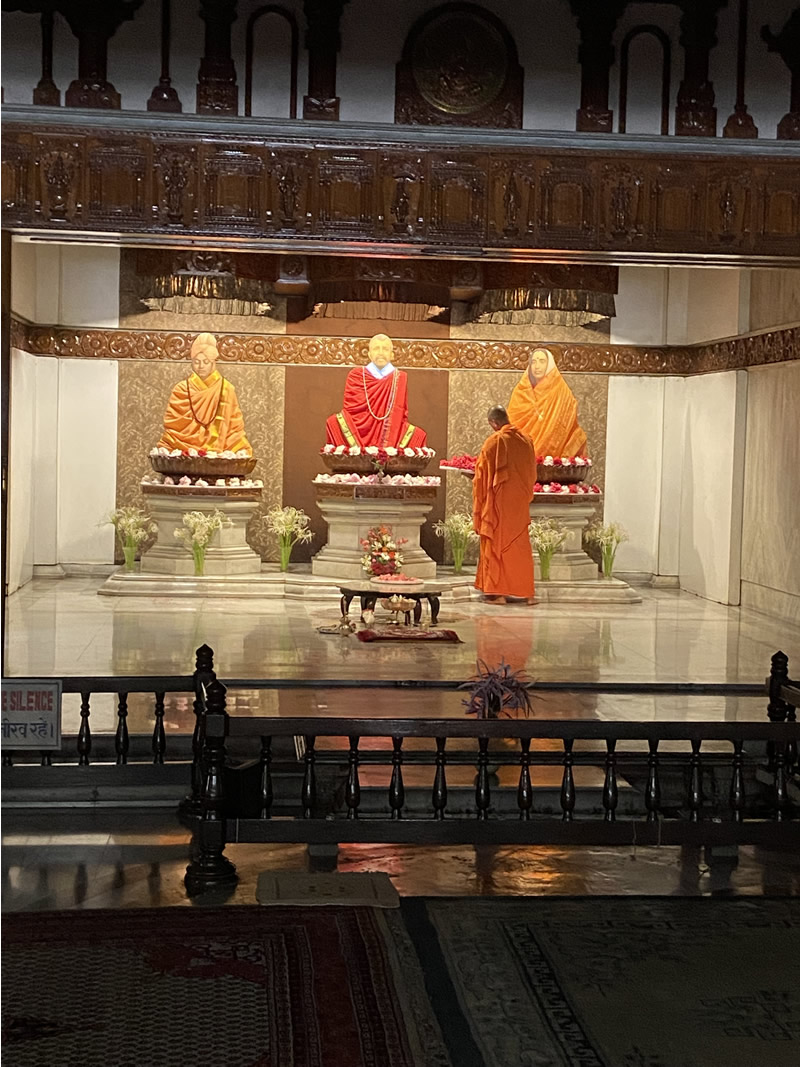 On Saturday, Prof. Pradip Swarnakar's senior research associate Pritha and his driver took me to Lucknow, the capital city of the state of Uttar Pradesh. During the 2.5 hour drive, we discussed her research with Pradip on the problem of Just Transition for the coal workers when India begins closing its coal mines. Along the way, we stopped at one of multitude of tiny tea stalls that dot the roadside. They served us tea in small clay cups that would then be broken and recycled. In Lucknow, we drove past all the Western clothing brand stores like Arrow (very popular with Indians, and probably made in India) and went to the traditional Indian clothing shops with handloom cloth and vegetable dye colors. There we found some beautiful presents for my grandchildren. In the afternoon, we visited the Ramakrishna Math (meditation center).
