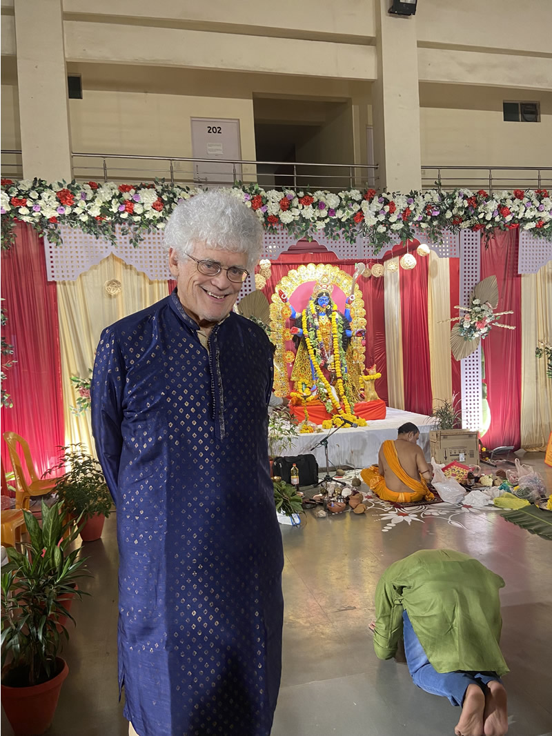 We walked into the hall and found many older people and a saffron loin-clothed Hindu priest preparing for the puja starting at midnight. The statue of the Blue Kali was indeed terrifying.