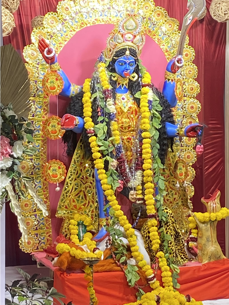 The statue of the Blue Kali in the photo was made for that puja ceremony. It is made of dried clay (not ceramic) and after the puja, the statue will be submerged into a river or lake to dissolve and wash away, further symbolizing her message of impermanence and death. The blue (or black, etc.) paint used to be lead-based, but the huge number of Kali statues was polluting India's rivers, so they switched to non-lead paint. The clay itself is very symbolic. It contains dirt from a city's brothel neighborhood signifying that even the most stigmatized people are God's children. The clay also contains cow dung and urine, because the cow is revered as Mother Cow (gomata), the giver of milk and nurturance. The Black Kali, like a black hole, absorbs all negativity, hatred, and anger, purifying the world. The great 19th c. spiritual teacher Ramakrishna worshipped Black Kali because she embodied the power (shakti) of the living dynamic universe, destroying the illusion of the ego and giving enlightenment. The photo shows an early and typical depiction, with necklace of severed heads and skirt of severed arms, signifying the erasure of old karma, and trampling on her husband, Lord Shiva (empowering women).