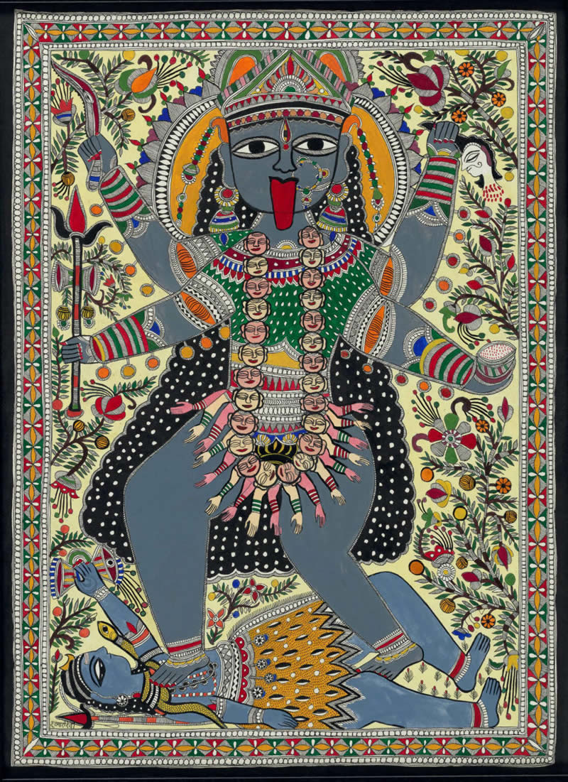 Her red tongue sticks out, dripping with the blood of evil people, and she wears a necklace of their severed heads dripping blood. Her four hands are red with blood; one holds a bloodied sword. Her ferocity, though, is directed at slaying the demons of evil and negativity in order to nurture and protect those who love her. That is why Kali is worshipped throughout India. The black, blue, white and many other Kalis have different qualities but all emanate from the same divine universal source. The Blue Kali symbolizes an existence beyond the material world. The Black Kali, similarly terrifying and more potent, symbolizes transformation, time, and death, forces that destroy illusions and the ego, making way for renewal and rebirth. In this way, Kali guides the soul toward liberation and as the Divine Mother, fills the universe with divine consciousness. Through this kind of worship, so many of the Indian people in their daily lives and despite so much poverty, I'm beginning to suspect, keep aware of the divine, cosmic essence of their being.