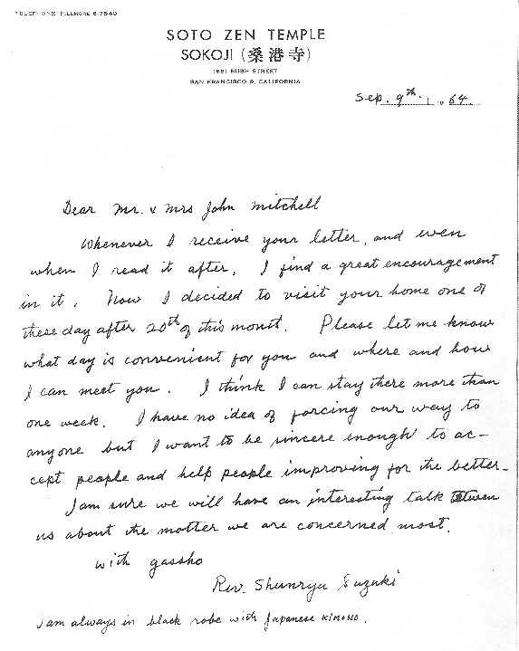 The Watts letter saying we should call Suzuki "roshi" and not reverend or sensei came in the fall of 1966 while Suzuki was in Japan. Richard Baker says that he and some others started calling Suzuki "roshi" earlier than that when Don Allen returned from Japan and told them they should call Suzuki "roshi." Right now - 2025- that's what he remembers but he was doing the Wind Bells back then and the Watts letter and Suzuki's reaction was in the Wind Bell.